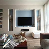 Luminoso Salone: Spazioso e accogliente, con pareti d'accento in un rilassante color azzurro polvere e nicchie retroilluminate per una zona living moderna e di forte impatto visivo.